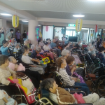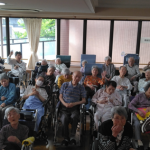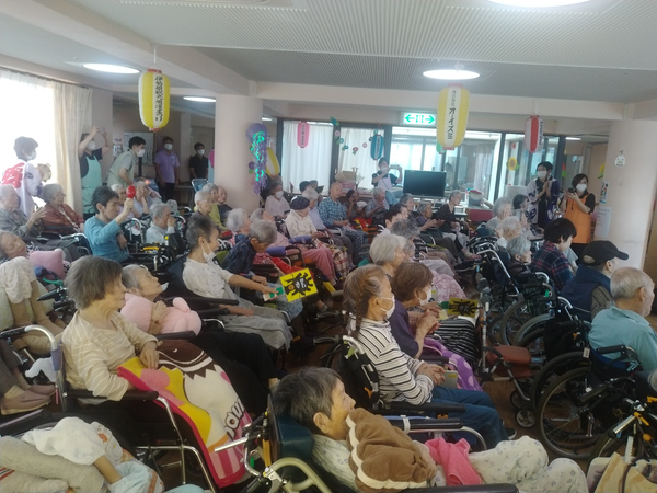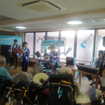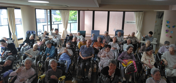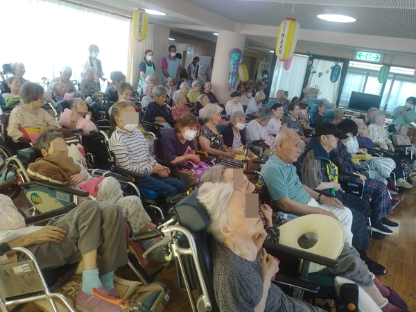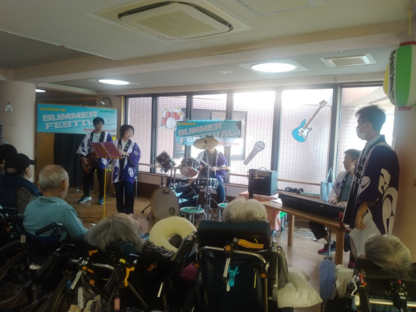 夏の音楽祭を行いました。皆様が知っている曲から若者向けの曲まで全7曲を披露しました。生演奏の迫力に手やうちわを振って応援してくれました。1階や3階の方々も聴きにきて大盛況でした!