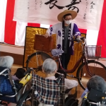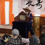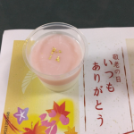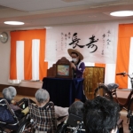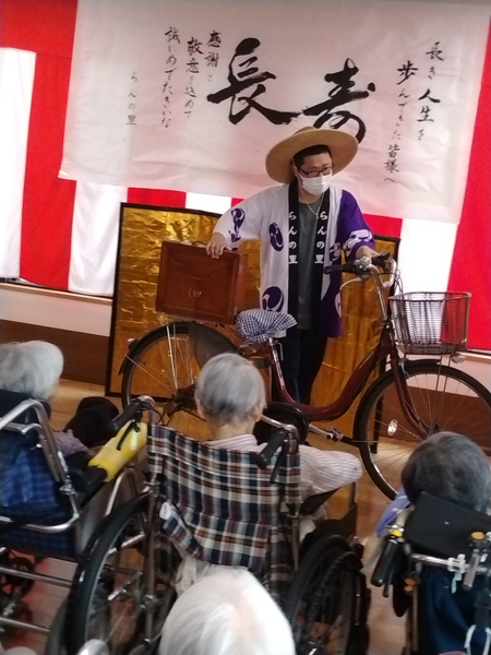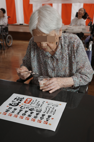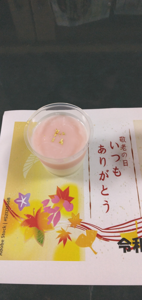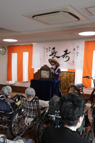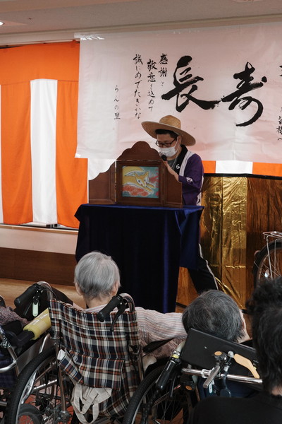 式典の後は、スタッフによる「紙芝居」鑑賞、手作りの「金箔入り紅白ゼリー」を召し上がっていただきました。