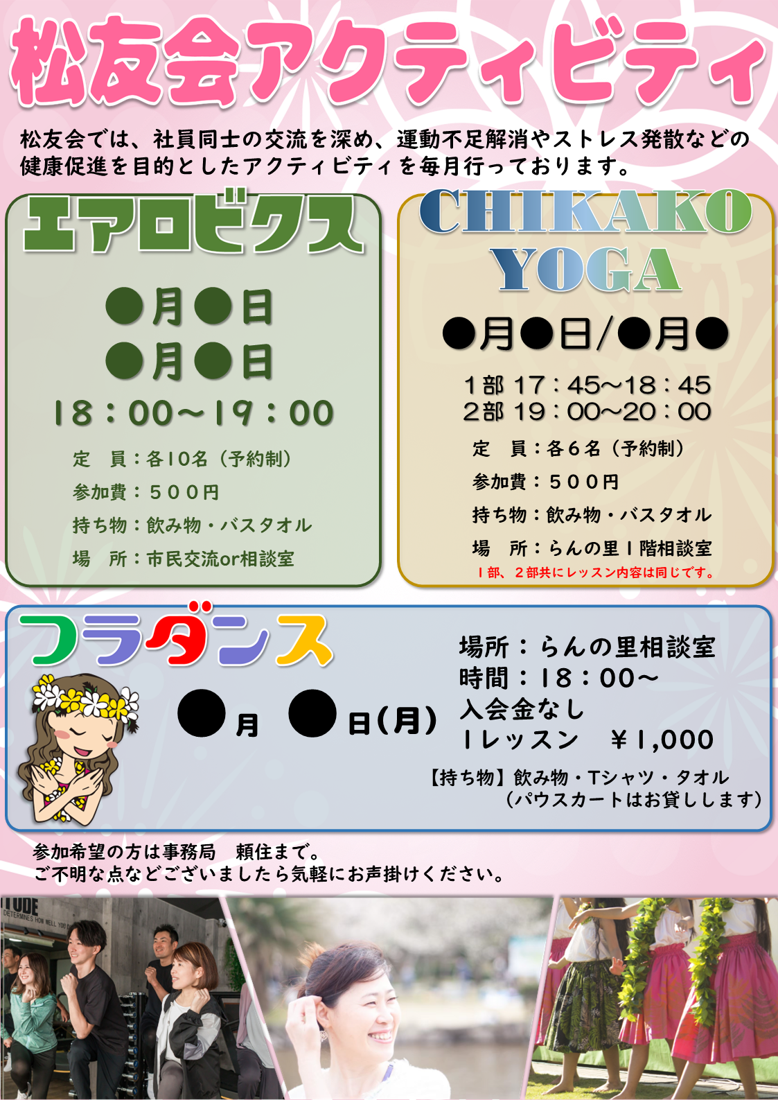 松友会 アクティビティ&クラブ活動紹介 松友会 アクティビティ&クラブ活動紹介 社会福祉法人松友会では、職員を対象にアクティビティやクラブ活動を行っております。 職員同士の交流を深める目的や運動不足・ストレス解消などの健康促進を目的として行っております。 2026年2月5日イベント,お知らせ